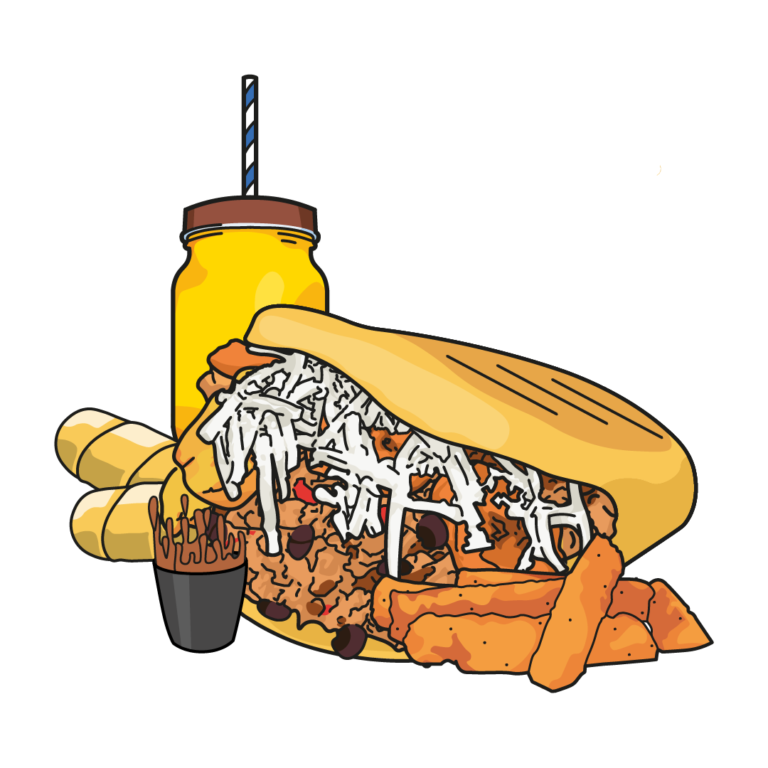 Rellena con carne mechada, frijoles negros cocidos a fuego lento, plátano frito y queso blanco rallado. Incluye dos tequeños de queso y una bebida.